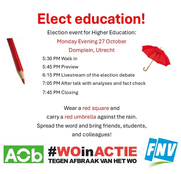 With the Dutch elections fast approaching, WOinActie and the FNV Onderwijs en Onderzoek and AOb unions are holding a campaign meeting at Dom Square in Utrecht on Monday 27 October. Various speakers will offer their perspectives before a live screening of the party leaders’ debate that the EFR study association and the EenVandaag TV show organise.