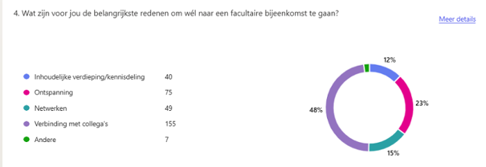 Responses to open questions provided suggestions for improvements. For instance, there’s a need for short, interactive knowledge sessions, of which the Faculty talks are a good example. Colleagues say they would like more room for discussions with each other, with less emphasis on long presentations of prizes or official parts in programmes. In addition, respondents believe it’s important to vary days and times, as well as allow for more interaction during events. Finally, staff find it hard to combine lengthy events on specific topics with a busy work schedule. But good ideas were also given on how we could have a lower threshold to inform each other about our research and education.