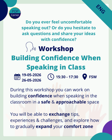 Do you sometimes feel uncomfortable speaking up during a lecture? Do you find it challenging to raise your hand in a seminar because the group feels large or overwhelming? Or do you hesitate to ask questions and share your ideas with confidence? If so, you are warmly invited to join this workshop — a safe and approachable space where you can work on developing confidence when speaking in the classroom. This workshop is organized by fellow students and offers room for open conversation about class participation. You will be able to exchange tips and experiences, explore how to gradually expand your comfort zone, and listen to stories from peers who face similar challenges.
