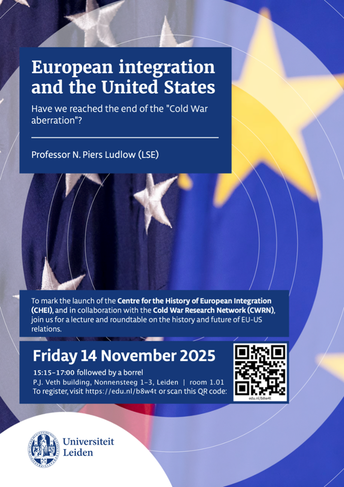 The event is organized by Dr. Matthew Broad on behalf of the Centre for the History of European Integration (CHEI) and held with the kind support of Leiden University's Europe Hub and the Institute for History’s and International Studies team.