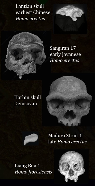 The hominin fossils from Eastern Asia display an extreme morphological variety. This testifies of a complex interplay of multiple dispersal waves, branching populations, temporary isolation, and interbreeding.