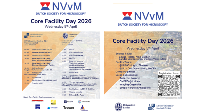 On Wednesday 8 April, the Netherlands Society for Microscopy (NVvM) will host the Imaging Core Facility Day 2026 in Leiden. Are you involved in microscopy-related facilities, techniques, or research, either within or outside the university? Then this day is definitely for you! The Faculty of Science of Leiden University and the Leiden University Medical Center (LUMC) warmly welcome you to their locations at the Leiden Bio Science Park.