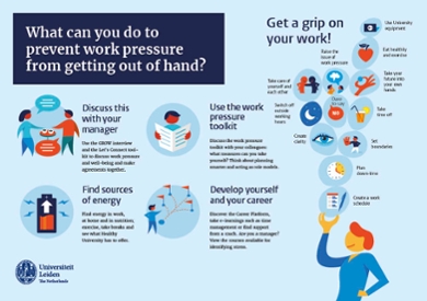 To create better work processes and reduce work pressure, the Work Balance Community of Practice has developed a work pressure toolkit (Dutch only). This toolkit consists of lists of measures to help faculties, units, and expertise centres to reduce work pressure at a local level. A number of these measures are implemented at University level, such as the ‘Leidse kwartier’ (practice of starting lectures 15 minutes later) at the start of a meeting, or managers acting as role models. Read more about what we do to reduce work pressure.