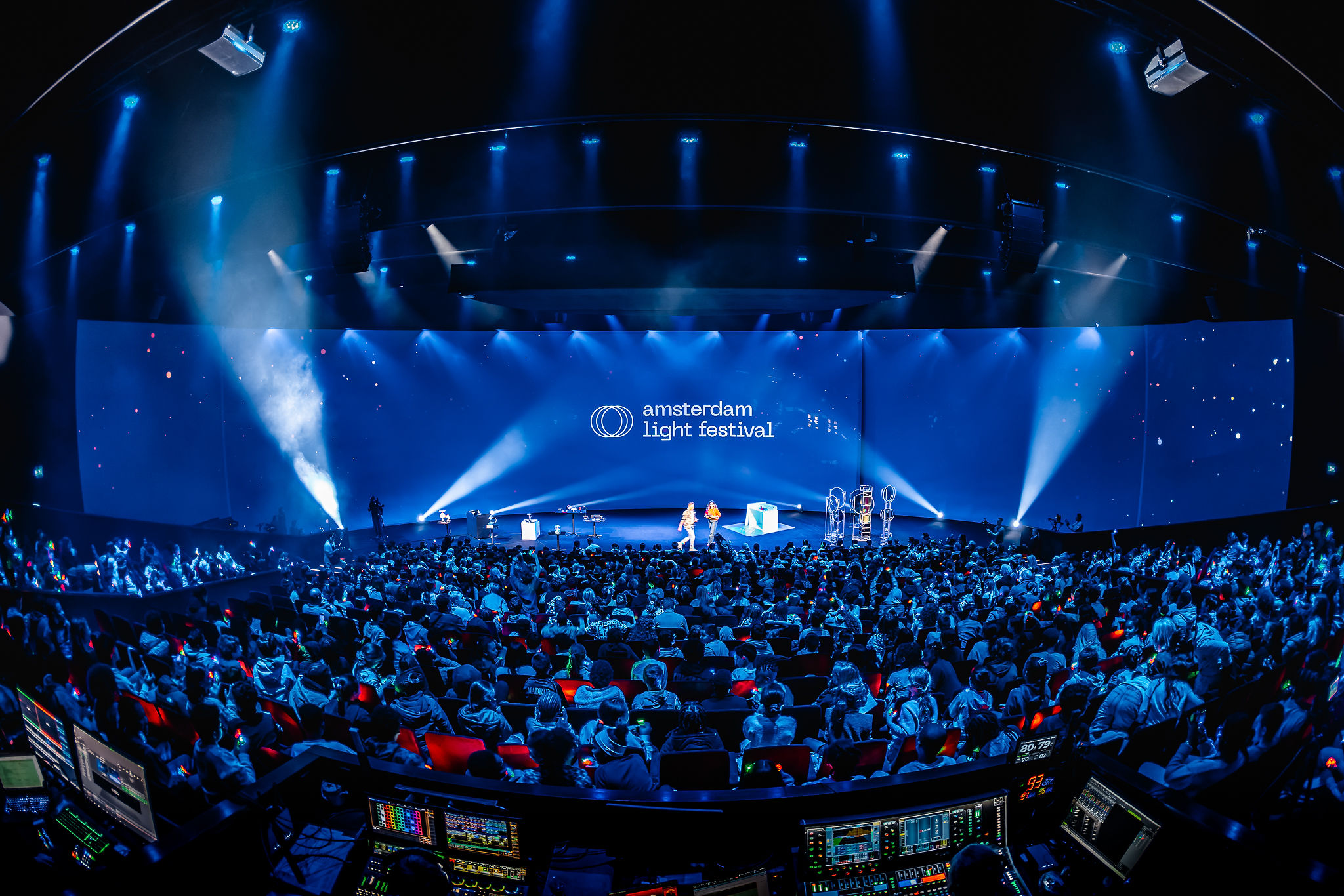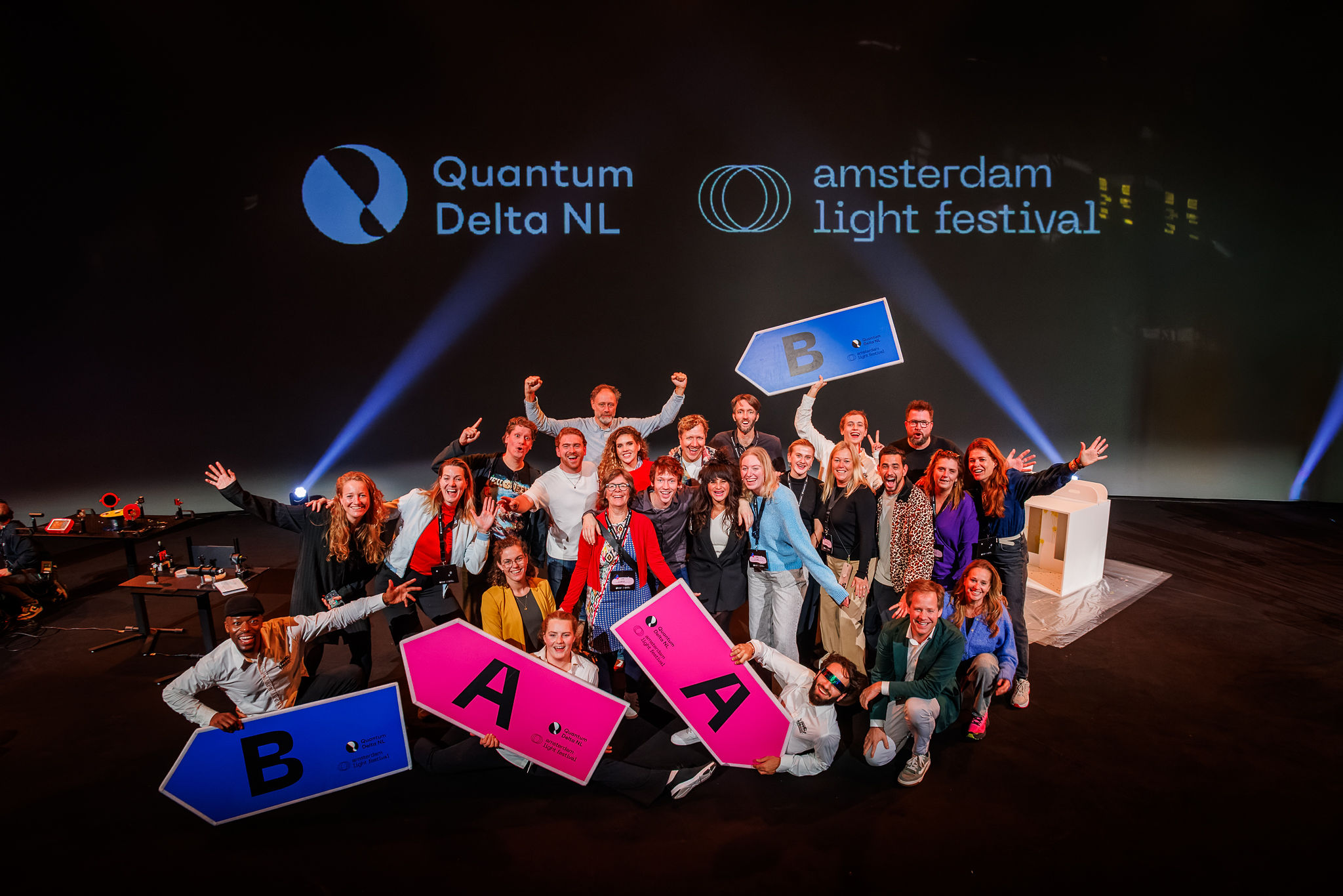 On October 30, it finally happened: 1,600 primary school pupils from Amsterdam gathered at Theater Amsterdam to watch the performance ‘Quantumfantum Multiversum’. Under the guidance of TV presenters Klaas van Kruistum and Rachel Rosier, the students were playfully introduced to the world of quantum technology. Through light art, several spectacular experiments were performed live on stage.