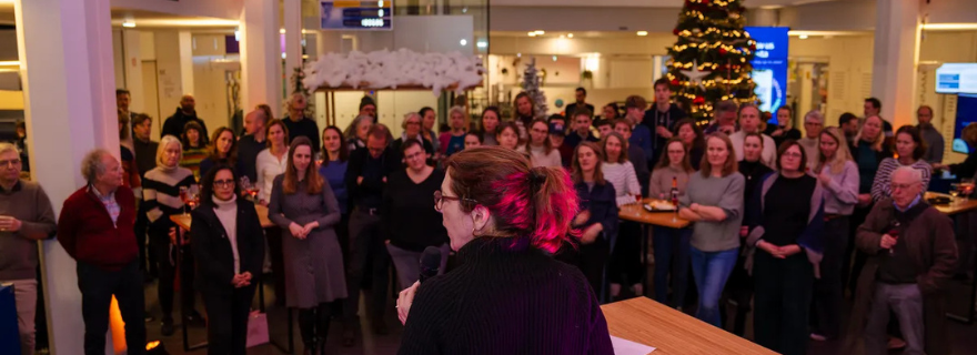Amid this winter scene stands the stage where Sarah de Rijcke begins her speech — her final one as dean of the faculty. “A very happy New Year; it is wonderful to be here together.” She reflects on her two-year deanship. According to her, the words ‘resilience’ and ‘movement’ best capture this period. “The circumstances in which the faculty had to operate — and still must operate — were completely different from what we had anticipated,” she says. “More challenging, above all.”