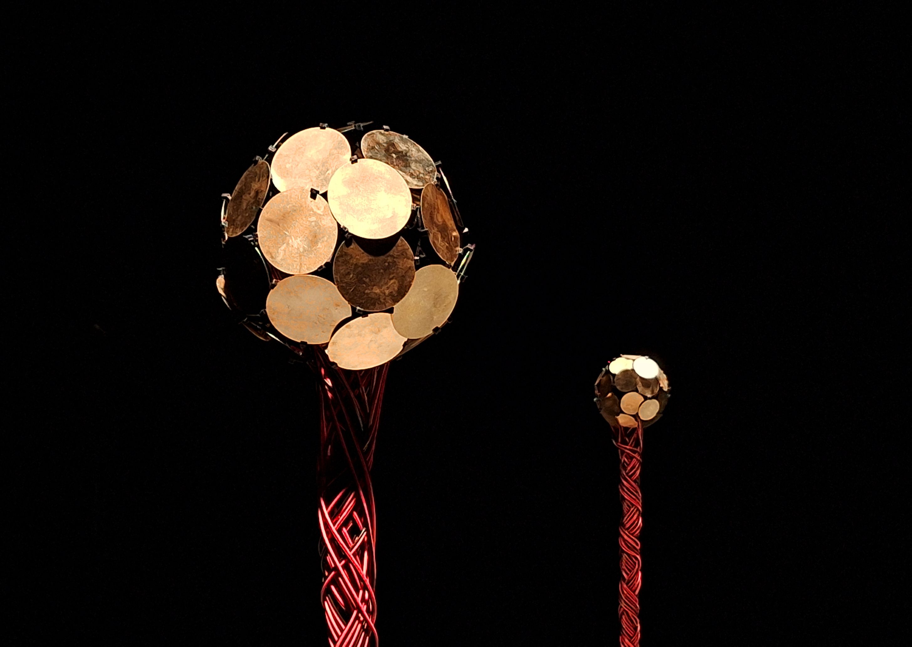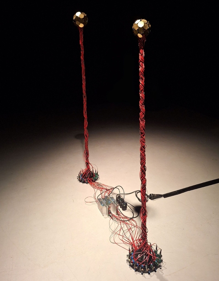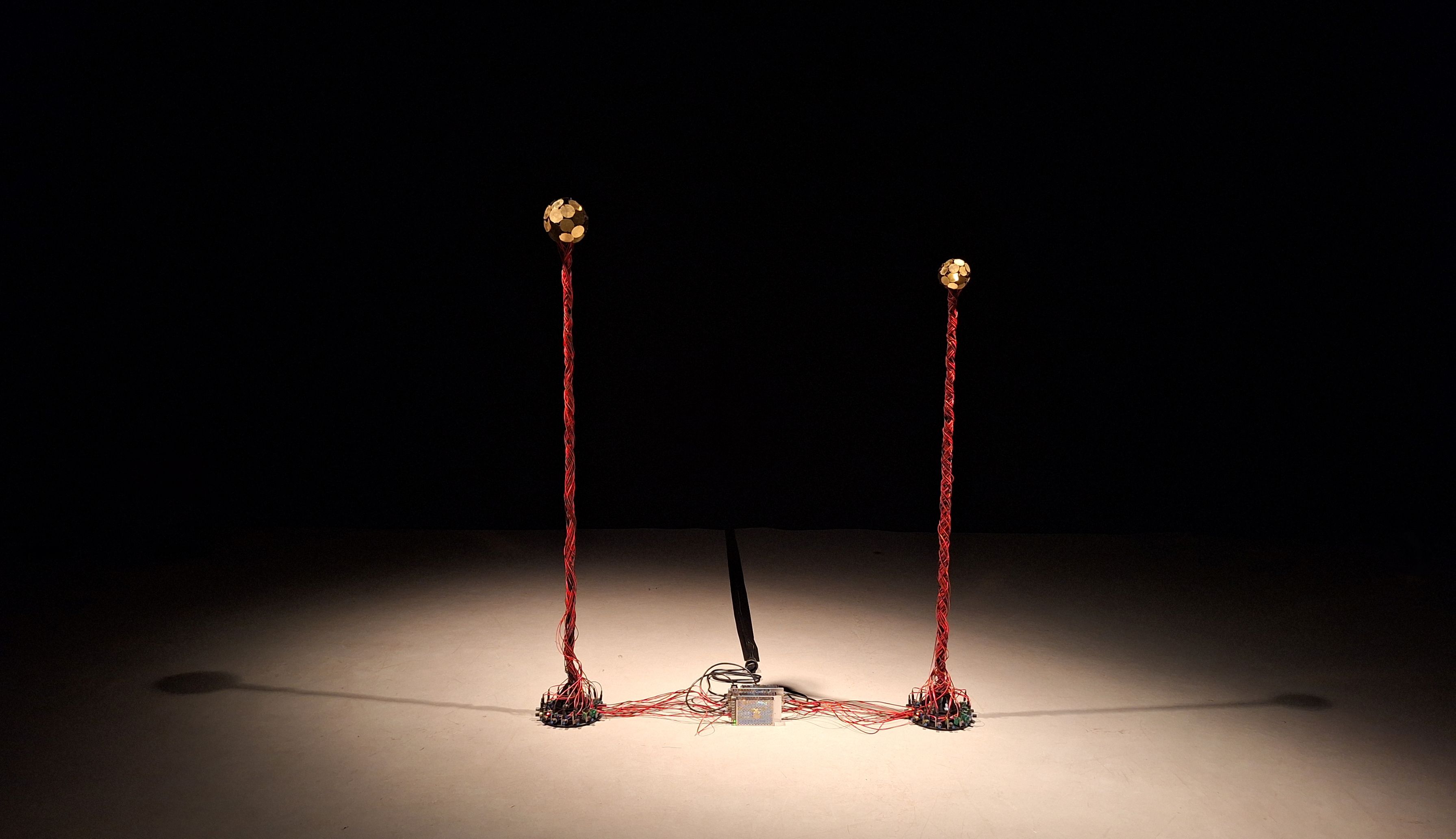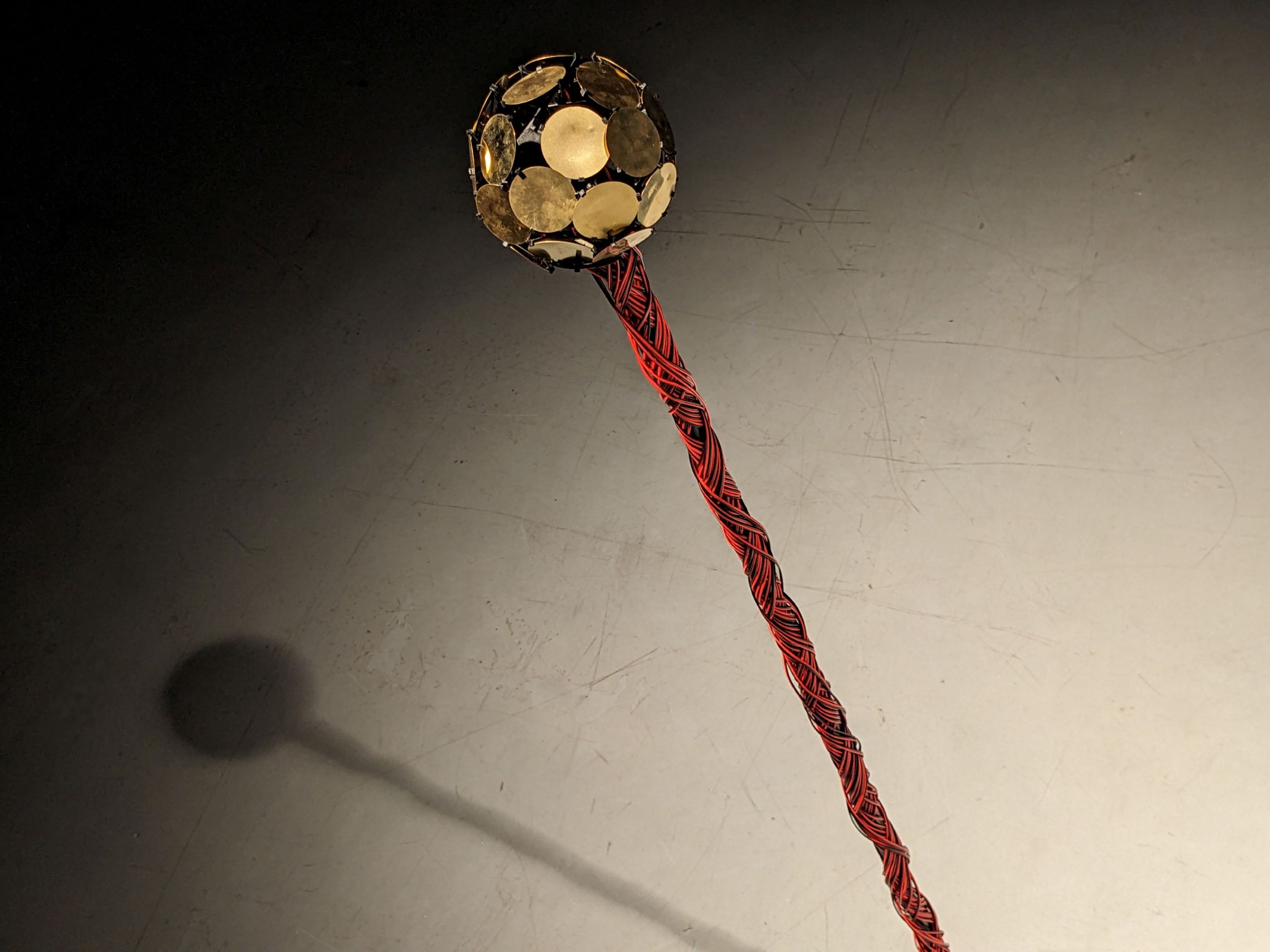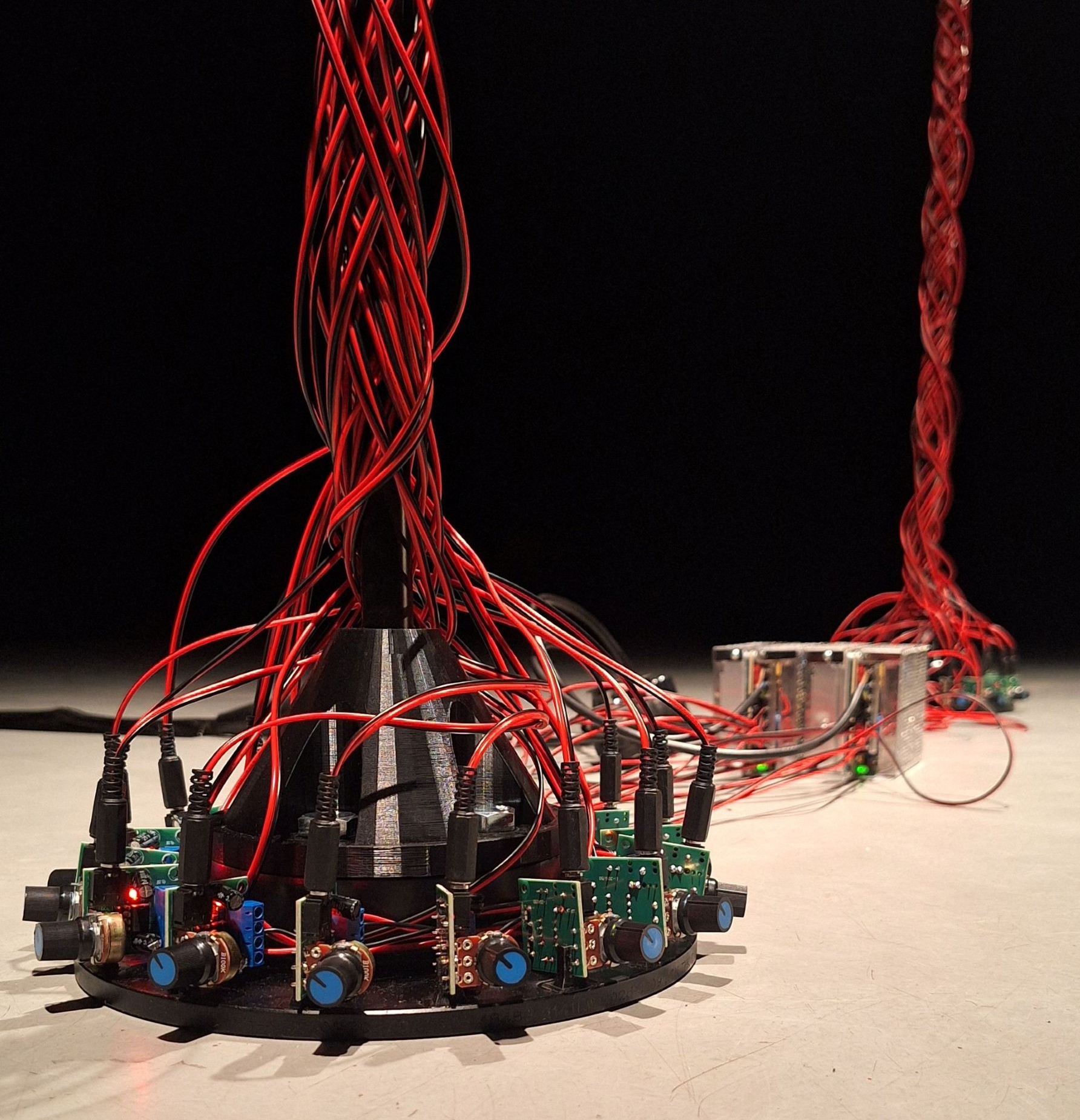 The sonic principle is simple: feedback. But for that to happen with piezos – a specific kind of transducer –, it is necessary for them to physically touch each other. So, the most important and time-consuming part of the project was to design a structure to hold the piezos in place. Not too tight, because the piezos need to vibrate, allowing also some room for playfulness and variation. Not so perfect that it loses its craft quality, while still having enough symmetry for feedback to happen and for a general look to take shape. And in such a way that the whole sculpture can be disassembled for transportation and storage so that my future self does not hate my past one: when you do not own a car, are not allowed to drive one (at least not in this part of the planet), and live in a bedroom, these things become a survivalist skill.