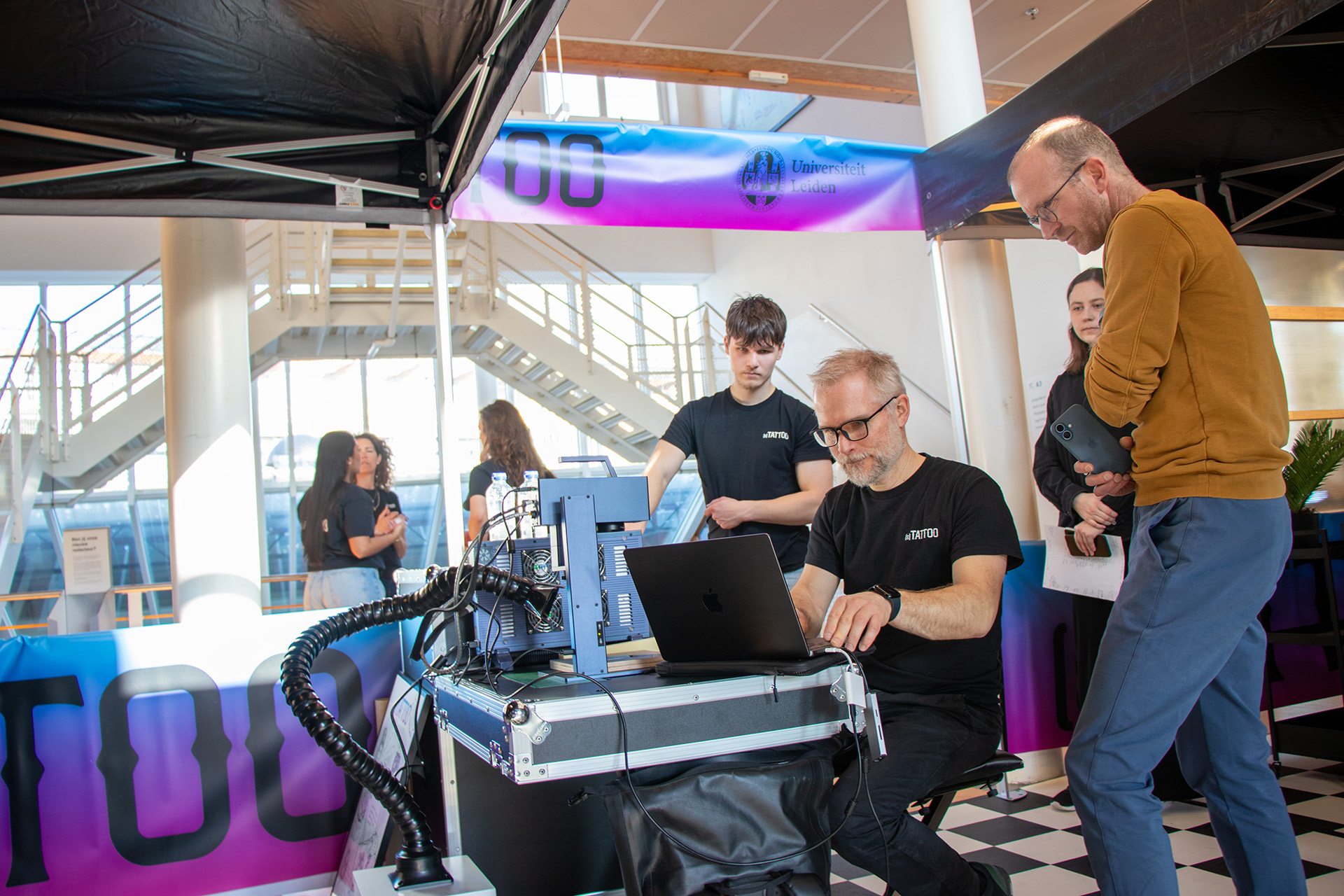 Not quite, because the aim of the [s]TATTOO studio is slightly different, explains creator and artist Maze de Boer from Art Partner. ‘People sit in the chair and talk with an artist who listens and asks open questions about what life is like here at Leiden University, how they’re feeling, what the atmosphere is like and so on. From that conversation, we’ll create an artwork in the form of a drawing or poem. You can then have it engraved onto a sticker or object like a phone case, water bottle or coffee cup.’