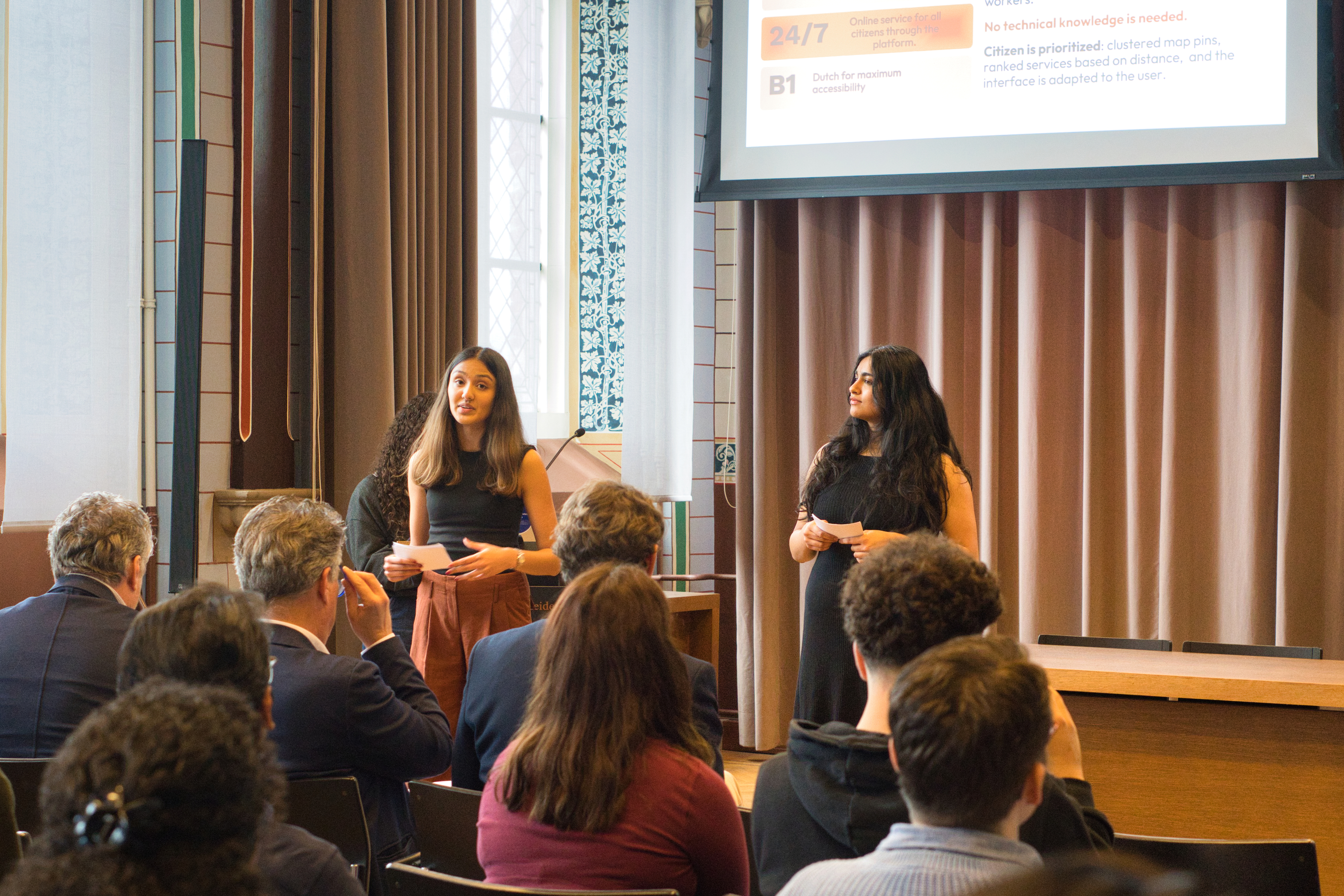 First prize went to Team 1, consisting of students Simar Suri, Mia van Gellecum, Nicole Stafanov, Tanisha Sandeep Phadke, Ana Fadul Ramos, and Lucas Danielian. They developed a social map for the Municipality of Leiden, allowing users to easily see which social services they are entitled to. With this, they won the grand prize of €3,000.